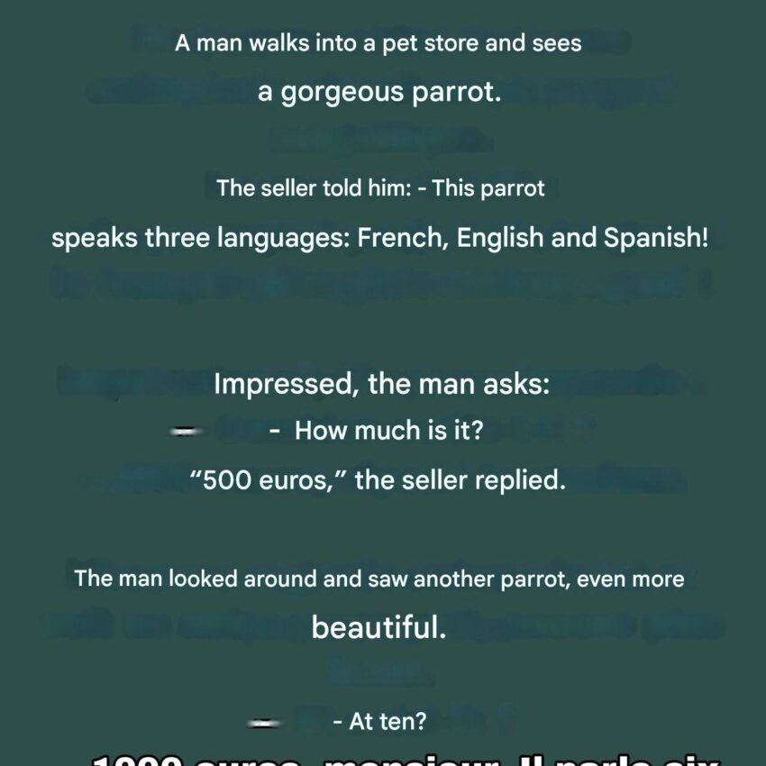 - Seller: “This parrot speaks three languages: French, English, and Spanish!”
