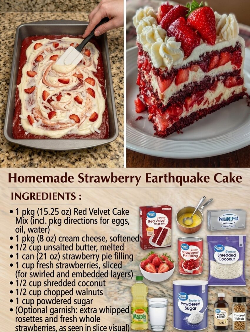 Here’s a rich, gooey Strawberry Earthquake Cake—a fun twist on the classic “earthquake cake” with swirls of cream cheese and bursts of strawberry flavor.