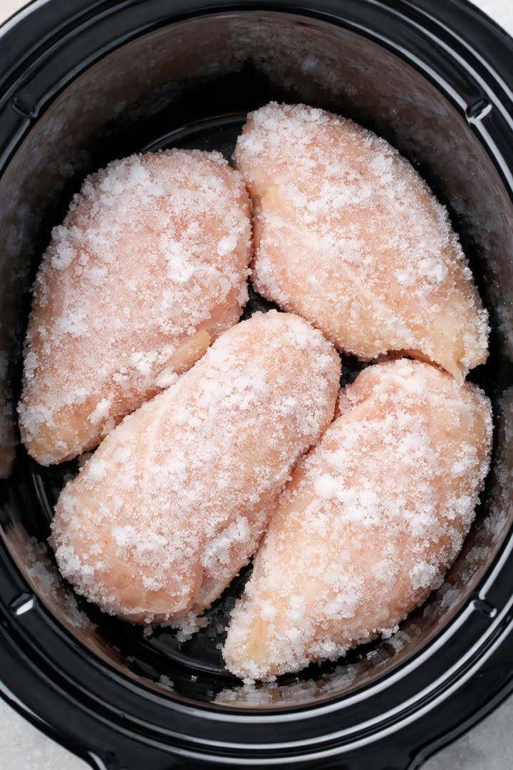 • Place frozen chicken breasts in the slow cooker. You can add sauce, broth, or seasonings.